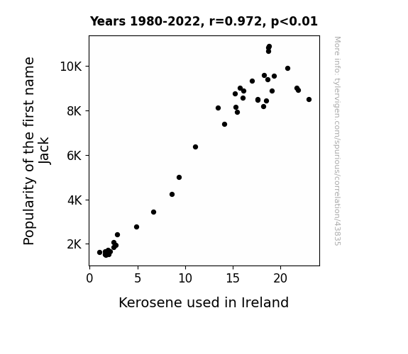 This means 94.5% of the change in the one variable (i.e., Kerosene used in Ireland) is predictable based on the change in the other (i.e., Popularity of the first name Jack) over the 43 years from 1980 through 2022.