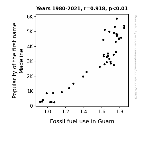 This means 84.2% of the change in the one variable (i.e., Fossil fuel use in Guam) is predictable based on the change in the other (i.e., Popularity of the first name Madeline) over the 42 years from 1980 through 2021.