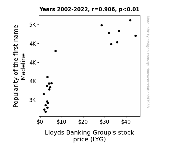 This means 82.1% of the change in the one variable (i.e., Lloyds Banking Group's stock price (LYG)) is predictable based on the change in the other (i.e., Popularity of the first name Madeline) over the 21 years from 2002 through 2022.