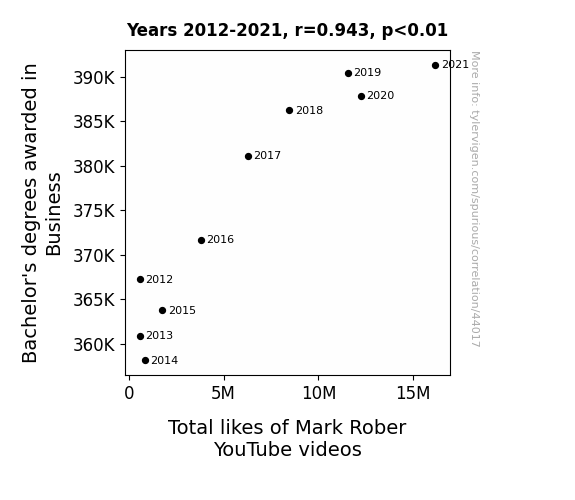 This means 88.9% of the change in the one variable (i.e., Total likes of Mark Rober YouTube videos) is predictable based on the change in the other (i.e., Bachelor's degrees awarded in Business) over the 10 years from 2012 through 2021.