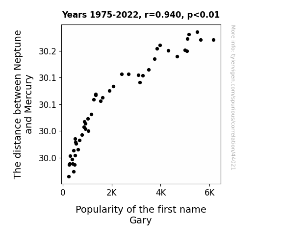 This means 88.4% of the change in the one variable (i.e., Popularity of the first name Gary) is predictable based on the change in the other (i.e., The distance between Neptune and Mercury) over the 48 years from 1975 through 2022.