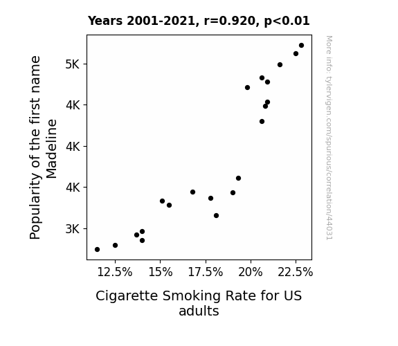 This means 84.7% of the change in the one variable (i.e., Cigarette Smoking Rate for US adults) is predictable based on the change in the other (i.e., Popularity of the first name Madeline) over the 21 years from 2001 through 2021.