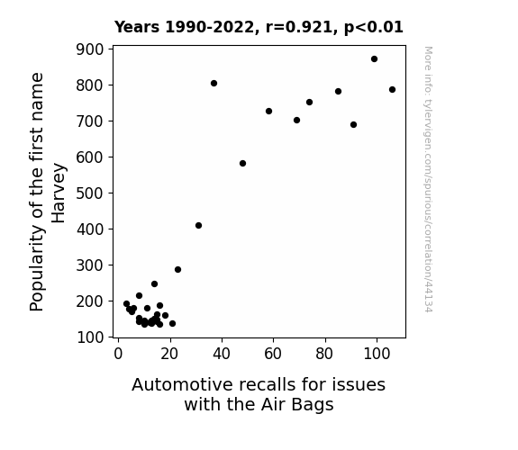 This means 84.9% of the change in the one variable (i.e., Automotive recalls for issues with the Air Bags) is predictable based on the change in the other (i.e., Popularity of the first name Harvey) over the 33 years from 1990 through 2022.