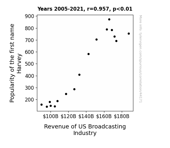 This means 91.5% of the change in the one variable (i.e., Revenue of US Broadcasting Industry) is predictable based on the change in the other (i.e., Popularity of the first name Harvey) over the 17 years from 2005 through 2021.