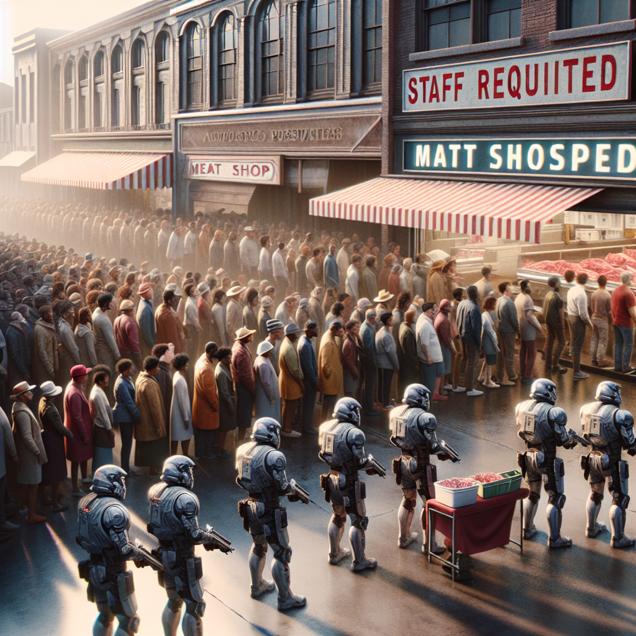User prompt: Please respond with an image generation prompt that would be likely to create an interesting visual using DALLE-3, using the following style: [ An image that looks like it is a scene from 'Star Wars' ] and depicting this scene: In downtown Iowa, a line of Republican voters stretches around the block, eagerly casting their votes for Senators. Meanwhile, a row of butcher shops sit empty, their "Help Wanted" signs hanging in the windows. The shortage of butchers has caused a frenzy, with people lining up to buy meat before it sells out. The clash of political opinions on meat production has sparked a heated debate, leaving Iowa with a scarcity of skilled workers to meet the demand for butchery. Keep the visual depiction simple. Do not include any words or speech bubbles.