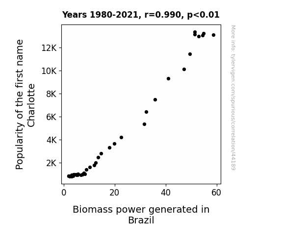This means 98% of the change in the one variable (i.e., Biomass power generated in Brazil) is predictable based on the change in the other (i.e., Popularity of the first name Charlotte) over the 42 years from 1980 through 2021.
