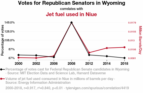 This means 84% of the change in the one variable (i.e., Jet fuel used in Niue) is predictable based on the change in the other (i.e., Votes for Republican Senators in Wyoming) over the 7 years from 2000 through 2018.