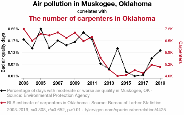 - The spurious research paper: Clearing the Air: A Breath of Fresh Data in Uncovering the Sawdust Connection Between Air Pollution and Carpenter Numbers in Muskogee, Oklahoma