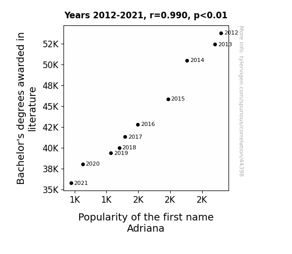 This means 98% of the change in the one variable (i.e., Popularity of the first name Adriana) is predictable based on the change in the other (i.e., Bachelor's degrees awarded in literature) over the 10 years from 2012 through 2021.