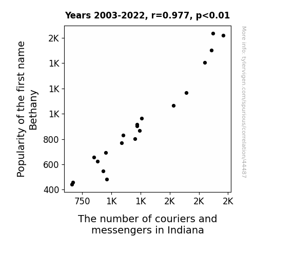 This means 95.5% of the change in the one variable (i.e., The number of couriers and messengers in Indiana) is predictable based on the change in the other (i.e., Popularity of the first name Bethany) over the 20 years from 2003 through 2022.