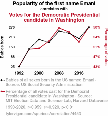 This means 92% of the change in the one variable (i.e., Votes for the Democrat Presidential candidate in Washington) is predictable based on the change in the other (i.e., Popularity of the first name Emani) over the 8 years from 1990 through 2020.