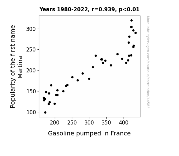 This means 88.1% of the change in the one variable (i.e., Gasoline pumped in France) is predictable based on the change in the other (i.e., Popularity of the first name Martina) over the 43 years from 1980 through 2022.