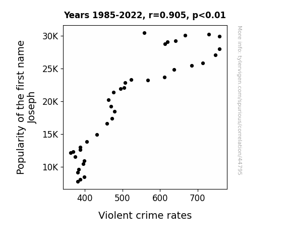 This means 81.9% of the change in the one variable (i.e., Violent crime rates) is predictable based on the change in the other (i.e., Popularity of the first name Joseph) over the 38 years from 1985 through 2022.