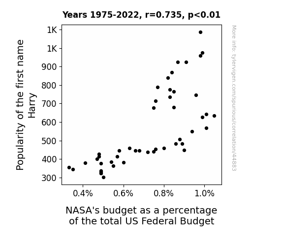 This means 54% of the change in the one variable (i.e., NASA's budget as a percentage of the total US Federal Budget) is predictable based on the change in the other (i.e., Popularity of the first name Harry) over the 48 years from 1975 through 2022.