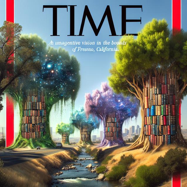 ChatGPT: Generate an image that envisions a TIME magazine cover featuring a whimsical scene in Fresno, California. The image should depict a landscape with magical book trees situated amongst traditional trees. The magical book trees should have pages for leaves and be absorbing carbon emissions, cleaning the air with a captivating, enchanting effect.