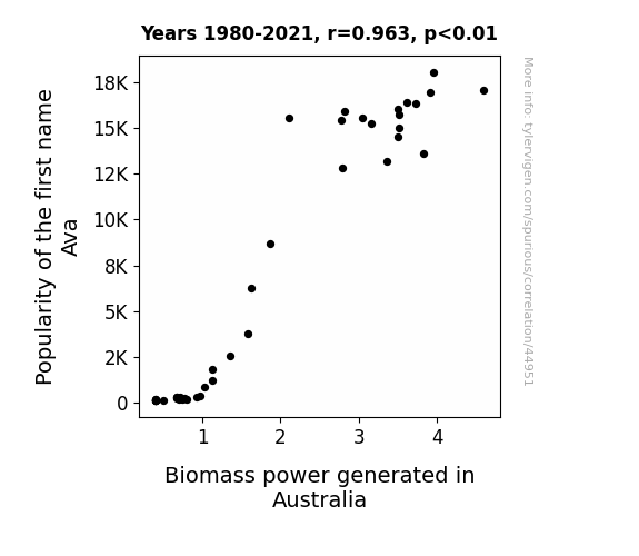 This means 92.7% of the change in the one variable (i.e., Biomass power generated in Australia) is predictable based on the change in the other (i.e., Popularity of the first name Ava) over the 42 years from 1980 through 2021.