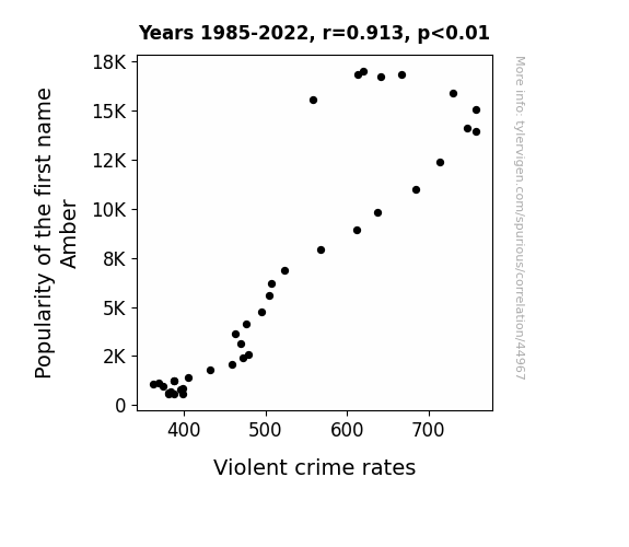 This means 83.4% of the change in the one variable (i.e., Violent crime rates) is predictable based on the change in the other (i.e., Popularity of the first name Amber) over the 38 years from 1985 through 2022.