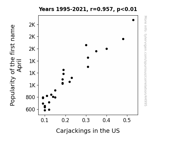 This means 91.5% of the change in the one variable (i.e., Carjackings in the US) is predictable based on the change in the other (i.e., Popularity of the first name April) over the 27 years from 1995 through 2021.