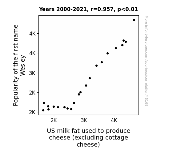 This means 91.6% of the change in the one variable (i.e., US milk fat used to produce cheese (excluding cottage cheese)) is predictable based on the change in the other (i.e., Popularity of the first name Wesley) over the 22 years from 2000 through 2021.