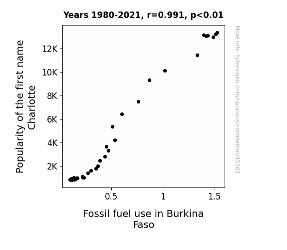 This means 98.2% of the change in the one variable (i.e., Fossil fuel use in Burkina Faso) is predictable based on the change in the other (i.e., Popularity of the first name Charlotte) over the 42 years from 1980 through 2021.