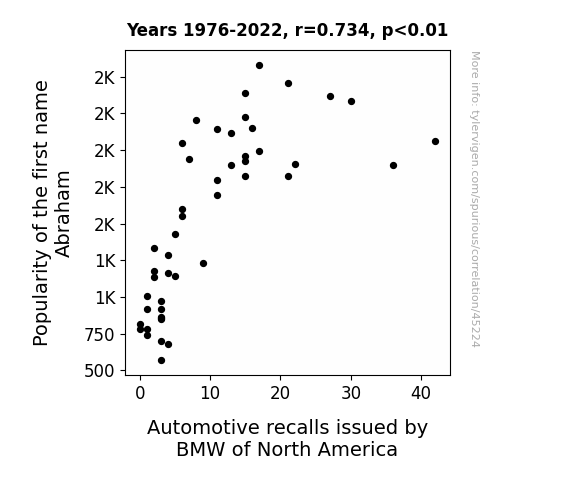 This means 53.9% of the change in the one variable (i.e., Automotive recalls issued by BMW of North America) is predictable based on the change in the other (i.e., Popularity of the first name Abraham) over the 47 years from 1976 through 2022.