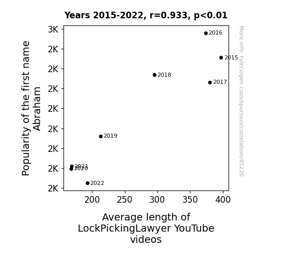 This means 87% of the change in the one variable (i.e., Average length of LockPickingLawyer YouTube videos) is predictable based on the change in the other (i.e., Popularity of the first name Abraham) over the 8 years from 2015 through 2022.