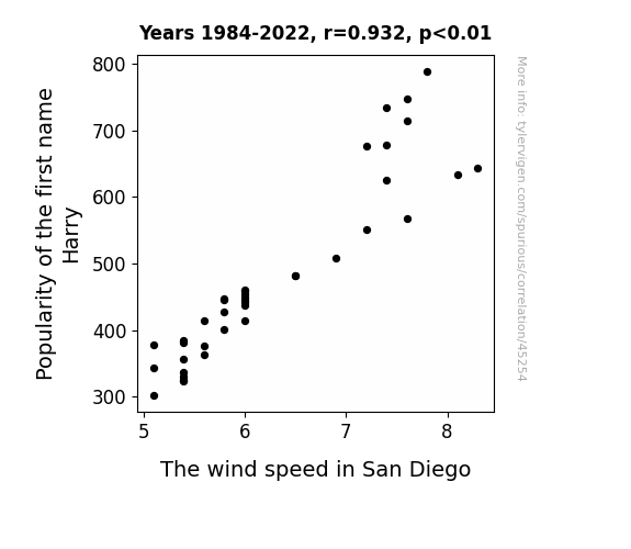 This means 86.8% of the change in the one variable (i.e., The wind speed in San Diego) is predictable based on the change in the other (i.e., Popularity of the first name Harry) over the 39 years from 1984 through 2022.