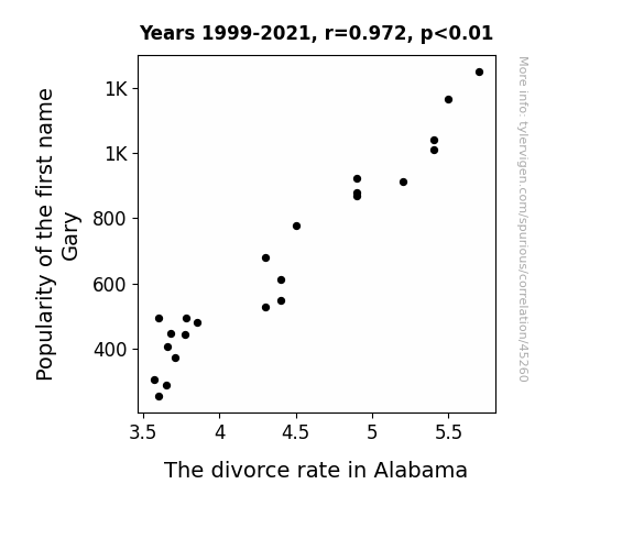 This means 94.4% of the change in the one variable (i.e., The divorce rate in Alabama) is predictable based on the change in the other (i.e., Popularity of the first name Gary) over the 23 years from 1999 through 2021.