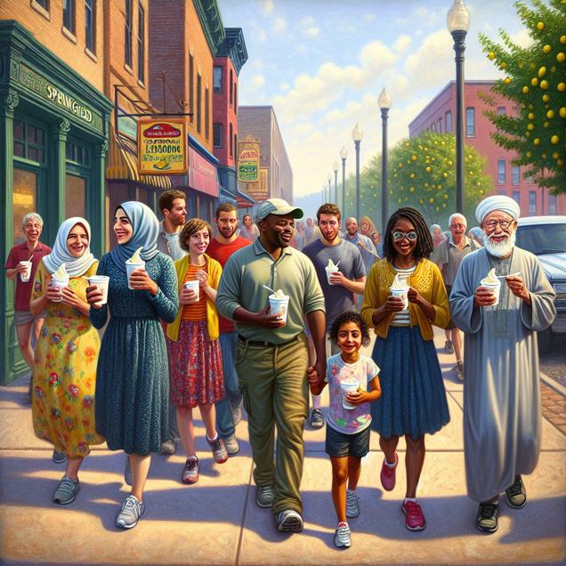 Prompt: Generate an image of a whimsical scene depicting a bustling street in Springfield, Ohio, where the air is filled with the crisp scent of a lemon orchard. In the foreground, show colorful and quirky characters strolling along carrying cups of creamy yogurt. The air around them should be depicted as light and airy, with hints of lemon and sweetness in the atmosphere. Capture the joy and contentment on the faces of the people as they savor the delicious, probiotic-rich treat, adding a touch of humor and lightheartedness to the scene, reminiscent of a playful Reddit post. The depiction should include only scenes, people, and objects, it should not include text or speech bubbles.