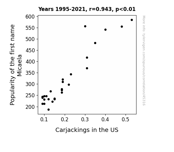 This means 88.9% of the change in the one variable (i.e., Carjackings in the US) is predictable based on the change in the other (i.e., Popularity of the first name Micaela) over the 27 years from 1995 through 2021.