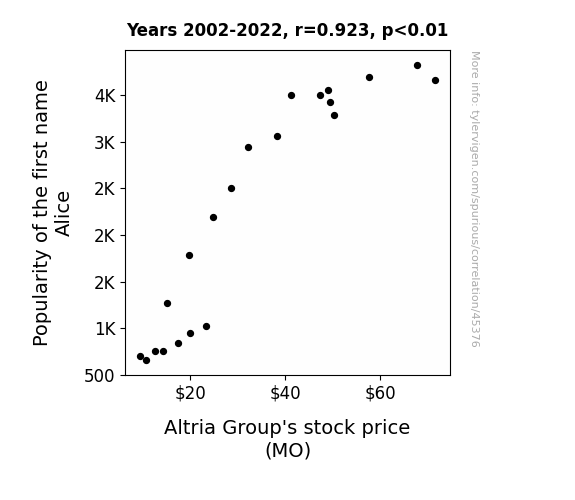 This means 85.3% of the change in the one variable (i.e., Altria Group's stock price (MO)) is predictable based on the change in the other (i.e., Popularity of the first name Alice) over the 21 years from 2002 through 2022.