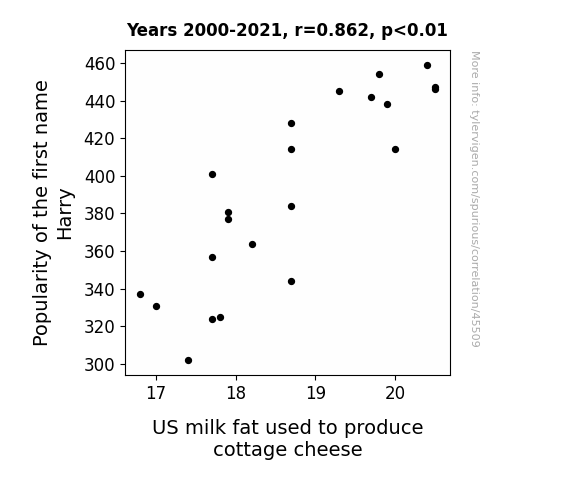 This means 74.3% of the change in the one variable (i.e., US milk fat used to produce cottage cheese) is predictable based on the change in the other (i.e., Popularity of the first name Harry) over the 22 years from 2000 through 2021.