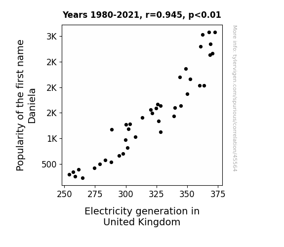 This means 89.2% of the change in the one variable (i.e., Electricity generation in United Kingdom) is predictable based on the change in the other (i.e., Popularity of the first name Daniela) over the 42 years from 1980 through 2021.