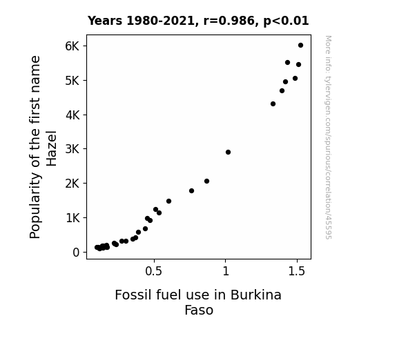 This means 97.3% of the change in the one variable (i.e., Fossil fuel use in Burkina Faso) is predictable based on the change in the other (i.e., Popularity of the first name Hazel) over the 42 years from 1980 through 2021.