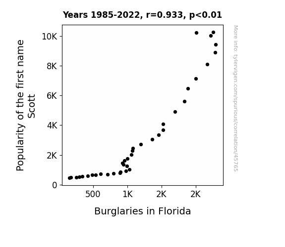This means 87.1% of the change in the one variable (i.e., Burglaries in Florida) is predictable based on the change in the other (i.e., Popularity of the first name Scott) over the 38 years from 1985 through 2022.