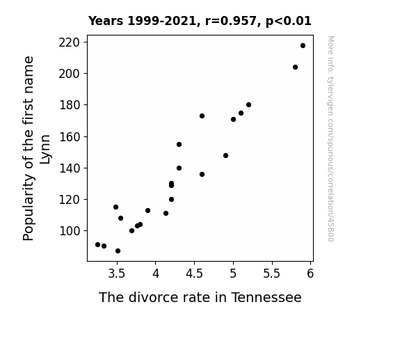 This means 91.7% of the change in the one variable (i.e., The divorce rate in Tennessee) is predictable based on the change in the other (i.e., Popularity of the first name Lynn) over the 23 years from 1999 through 2021.