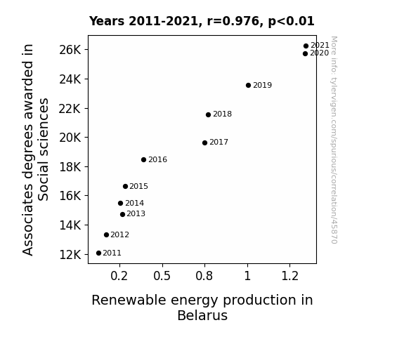 This means 95.2% of the change in the one variable (i.e., Renewable energy production in Belarus) is predictable based on the change in the other (i.e., Associates degrees awarded in Social sciences) over the 11 years from 2011 through 2021.