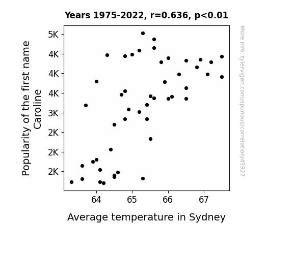 This means 40.5% of the change in the one variable (i.e., Average temperature in Sydney) is predictable based on the change in the other (i.e., Popularity of the first name Caroline) over the 48 years from 1975 through 2022.