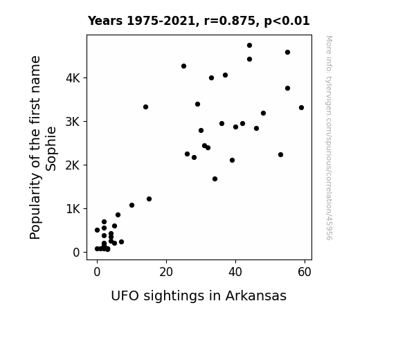 This means 76.5% of the change in the one variable (i.e., UFO sightings in Arkansas) is predictable based on the change in the other (i.e., Popularity of the first name Sophie) over the 47 years from 1975 through 2021.
