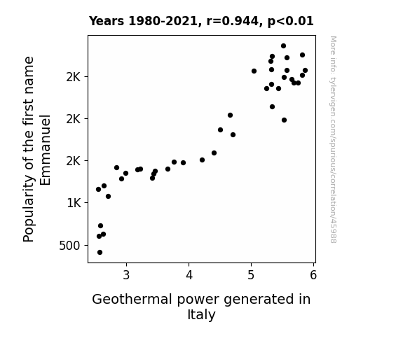This means 89.1% of the change in the one variable (i.e., Geothermal power generated in Italy) is predictable based on the change in the other (i.e., Popularity of the first name Emmanuel) over the 42 years from 1980 through 2021.
