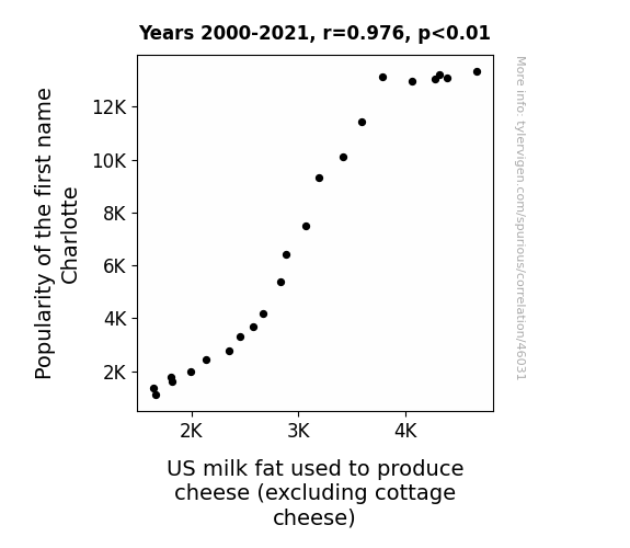 This means 95.3% of the change in the one variable (i.e., US milk fat used to produce cheese (excluding cottage cheese)) is predictable based on the change in the other (i.e., Popularity of the first name Charlotte) over the 22 years from 2000 through 2021.