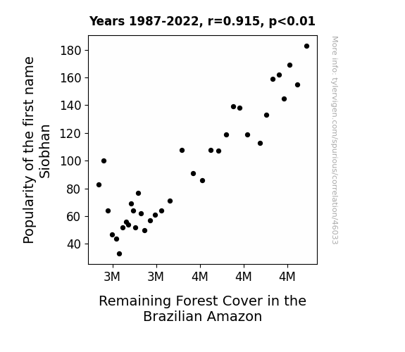 This means 83.7% of the change in the one variable (i.e., Remaining Forest Cover in the Brazilian Amazon) is predictable based on the change in the other (i.e., Popularity of the first name Siobhan) over the 36 years from 1987 through 2022.