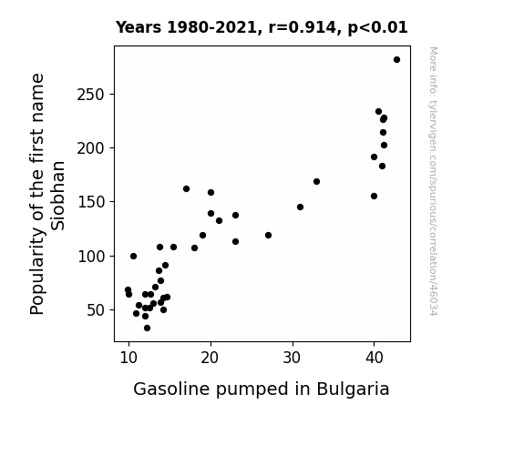 This means 83.5% of the change in the one variable (i.e., Gasoline pumped in Bulgaria) is predictable based on the change in the other (i.e., Popularity of the first name Siobhan) over the 42 years from 1980 through 2021.