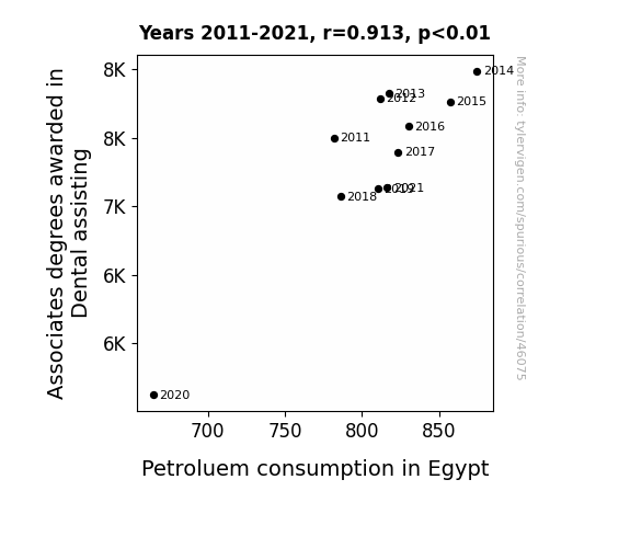 This means 83.3% of the change in the one variable (i.e., Petroluem consumption in Egypt) is predictable based on the change in the other (i.e., Associates degrees awarded in Dental assisting) over the 11 years from 2011 through 2021.