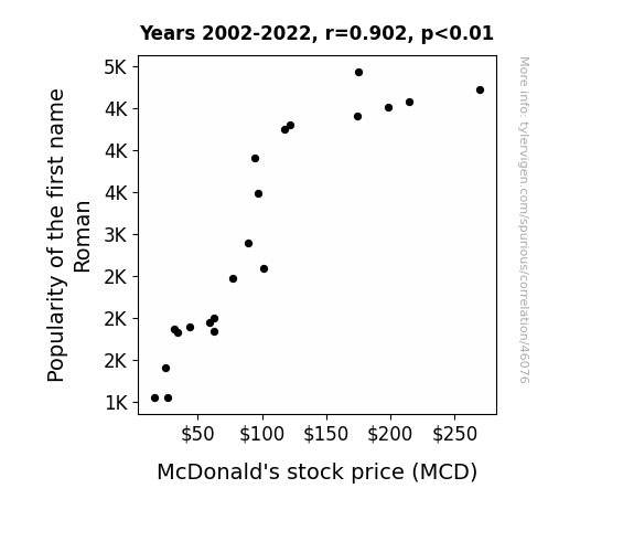 This means 81.4% of the change in the one variable (i.e., McDonald's stock price (MCD)) is predictable based on the change in the other (i.e., Popularity of the first name Roman) over the 21 years from 2002 through 2022.