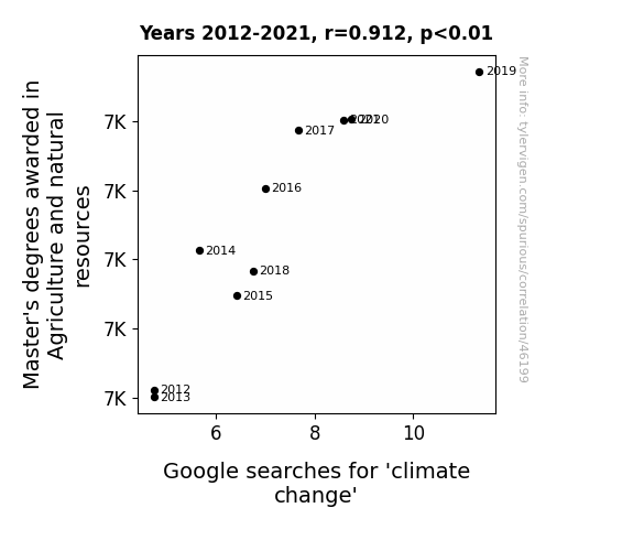 This means 83.2% of the change in the one variable (i.e., Google searches for 'climate change') is predictable based on the change in the other (i.e., Master's degrees awarded in Agriculture and natural resources) over the 10 years from 2012 through 2021.