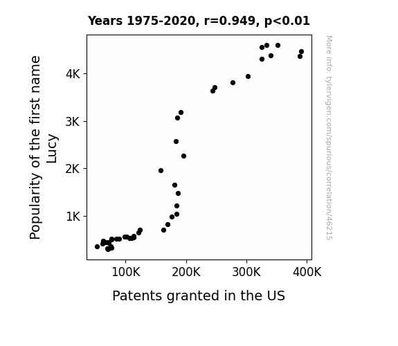 This means 90.1% of the change in the one variable (i.e., Patents granted in the US) is predictable based on the change in the other (i.e., Popularity of the first name Lucy) over the 46 years from 1975 through 2020.