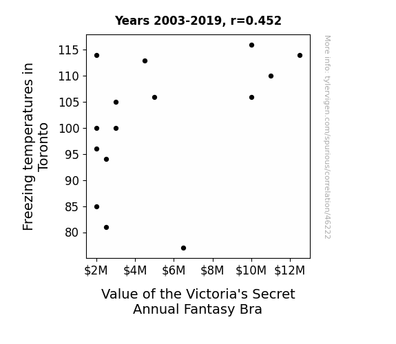 This means 20.4% of the change in the one variable (i.e., Value of the Victoria's Secret Annual Fantasy Bra) is predictable based on the change in the other (i.e., Freezing temperatures in Toronto) over the 15 years from 2003 through 2019.