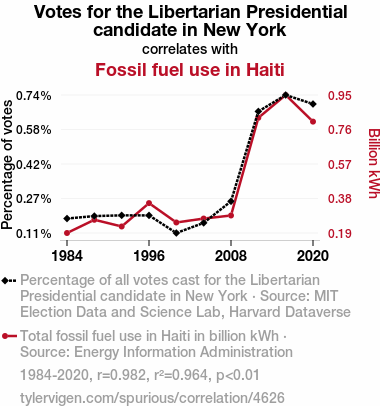 - The spurious research paper: The Libertarian Effect: Unveiling the Fossilized Connection Between New York's Presidential Votes and Haiti's Fuel Consumption