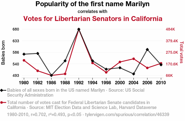 p-value calculation does not take this into account, so mathematically it appears less probable than it really is. - Y-axis doesn't start at zero: I truncated the Y-axes of the graph above. I also used a line graph, which makes the visual connection stand out more than it deserves.